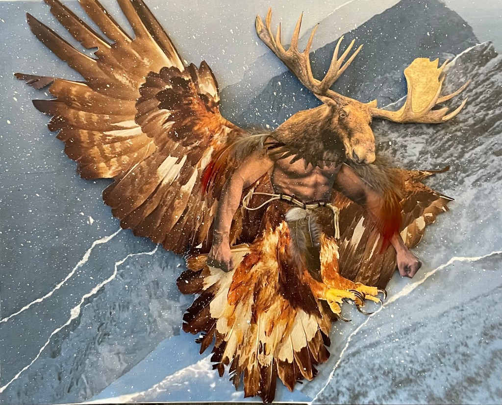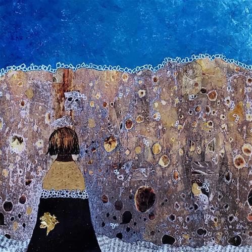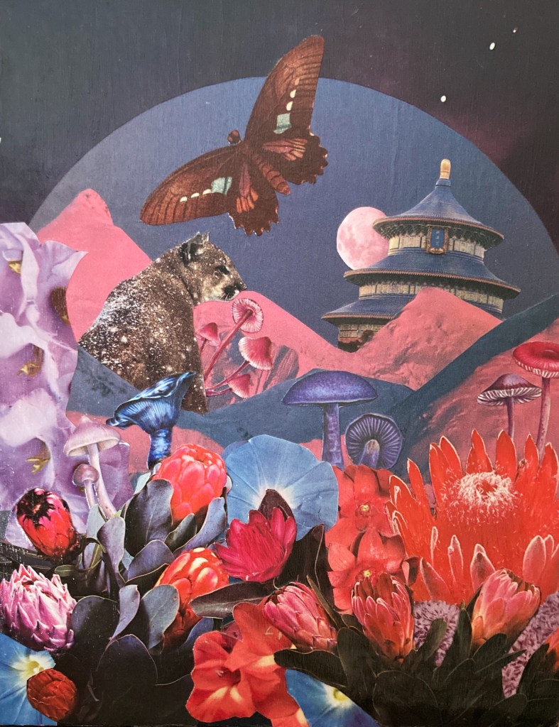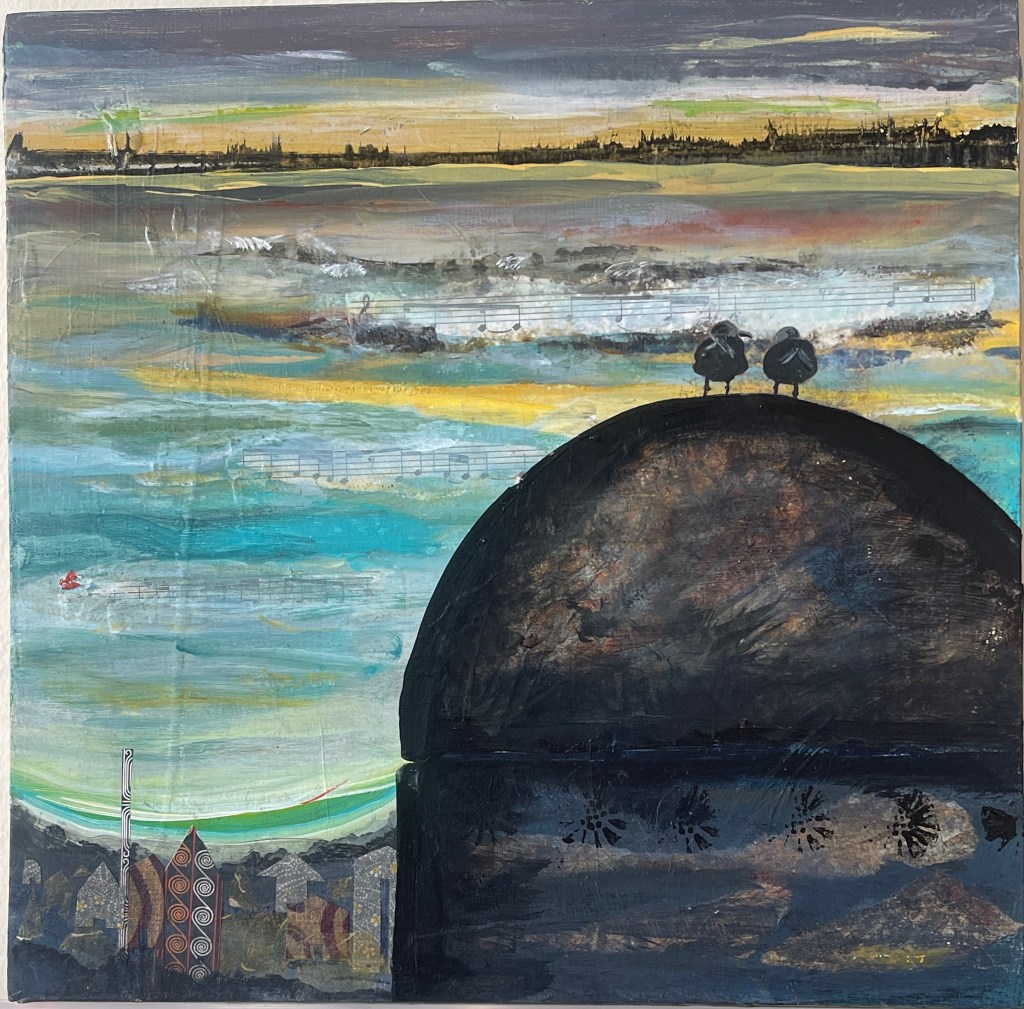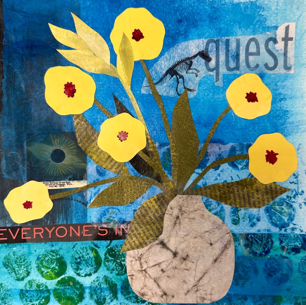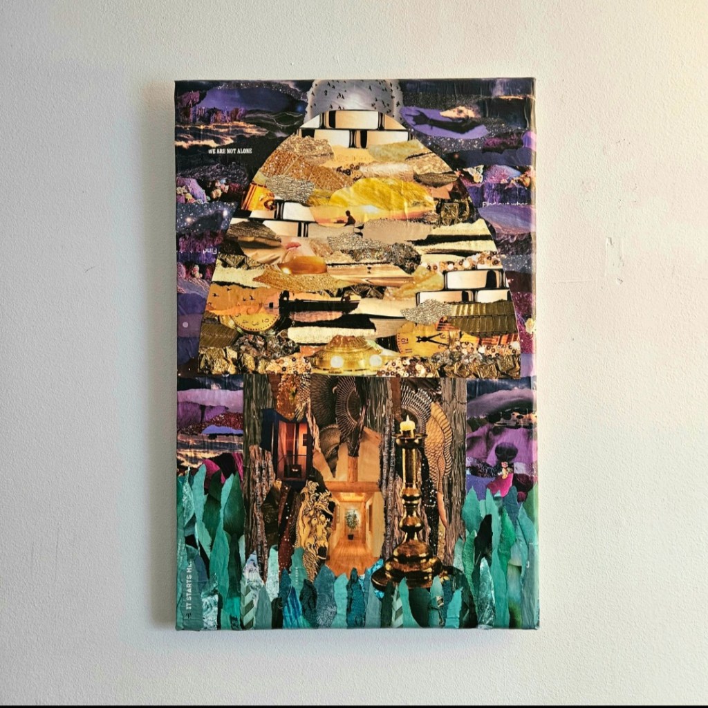 Medium: acrylic, paper cuts, mixed media, up-cycled materials