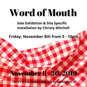 Christy will continue to serve as the Director of The S.P.A.C.E. Gallery, with additional staff for open hours and events. If you are interested in volunteering or part time work, please email us at spacegalleryvt@gmail.com. We are so excited!