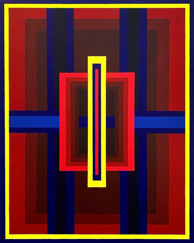Frank Tamasi is a newer artist to The S.P.A.C.E. Gallery and creates meticulous geometric pieces by hand (without tape or straight edges) feeling each line and selecting each color deliberately. Tamasi states that, “Color theory plays a vital role in my work allowing me to express inner-energies that otherwise leave me at a loss of words….The layering of colors immerse you deeper and deeper as you look at it longer. It creates an experience that not only brings light into any room, but ignites an emotion internally through the vibrations.”